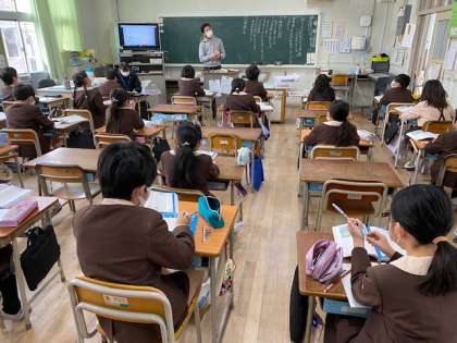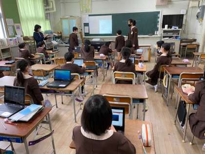 3年生1・2組の授業のようすです。どちらも国語で、1組は「ゆうすけ村の小さな旅館」の学習をしています。2組は「外国のことをしょうかいしよう」について班ごとに協力して調べて作ったパワーポイントの資料を映しながら発表をしています。