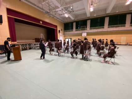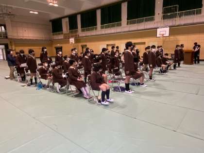 5年生1・2組の授業のようすです。学年全体で、卒業式で映像を流す予定の「お祝いのことば」の練習をしています。