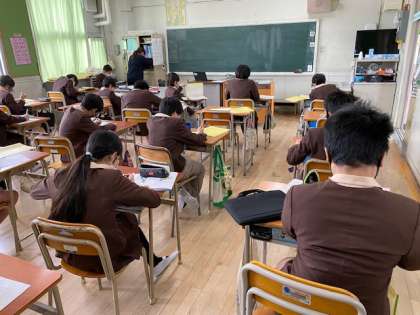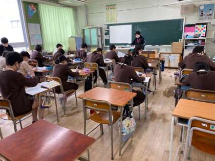 6年生1・2組の授業のようすです。1組は算数で、教科書の総まとめの練習問題を解いています。2組は総合で、「キャリアシート」に記入しています。