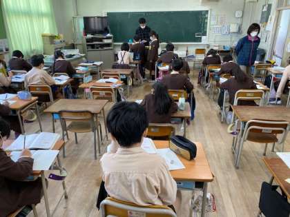 3年生1・2組の授業のようすです。どちらも算数で、教科書の「もうすぐ 4年生」の練習問題を解いています。