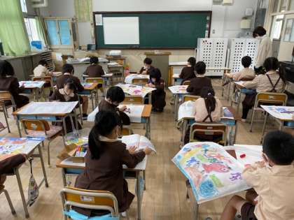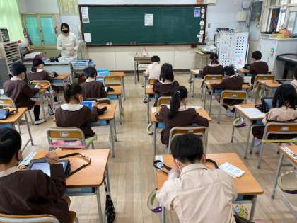 1年生1・2組の授業のようすです。1組は作品袋を作っています。2組はタブレット端末を使って、「まなびのポータル」にログインする練習をしています。