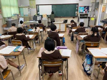 2年生1・2組の授業のようすです。どちらも算数で、1組はドリルに取り組んでいます。2組はテストの答えの解説をしています。