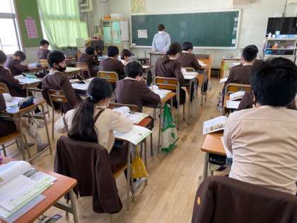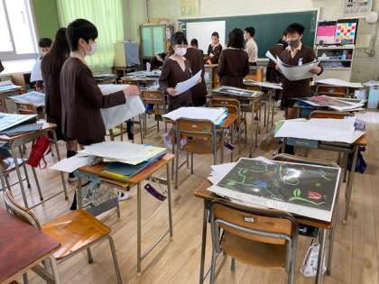 6年生1・2組の授業のようすです。1組はさまざまな作品をみんなで手分けして返却しています。2組は道徳で、「のぼさんの夢 -正岡子規-」を先生が読んでいます。