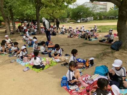 たくさん遊んで、お弁当の時間です。おいしいお弁当、ありがとうございます。少し離れて並んで食べました。