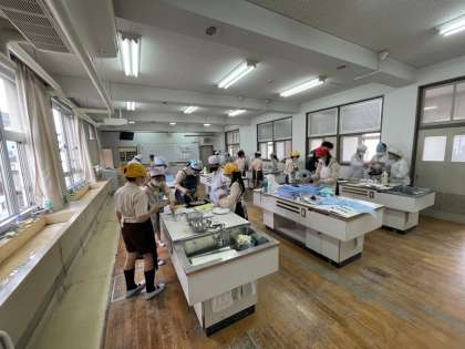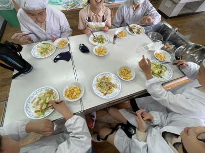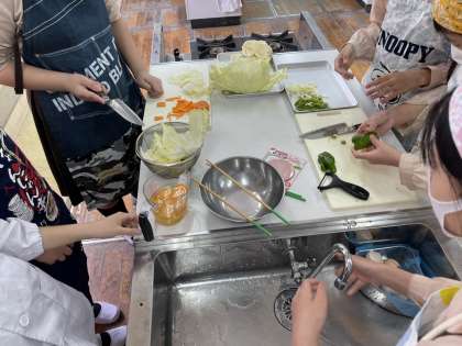 野菜炒めとスクランブルエッグを調理しました。協力して美味しく完成しました。食器類や調理器具の準備や後片付けも一生懸命頑張りました。