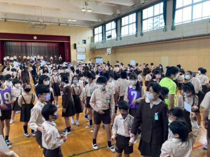 集会委員会が1年生に野里小学校を知ってもらうためにクイズを出しました。たてわり班で一緒に楽しみました。