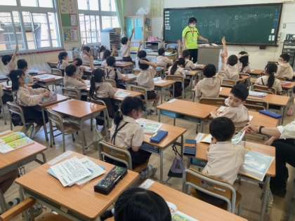1年生の算数は、「なんばんめ」を学習しています。右から5台目の車に色を塗りましょう。左から4羽の鳥に色を塗りましょう。など、「いくつ」と「いくつめ」の違いを確かめています。