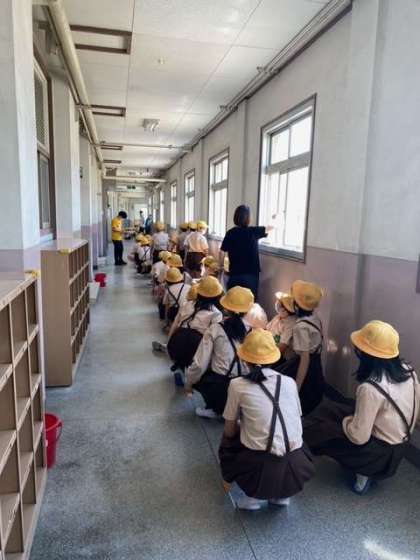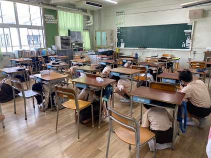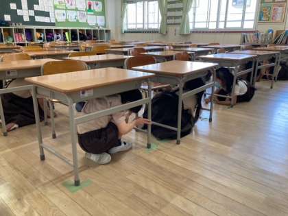 地震・津波による避難訓練を行いました。まずは身を守ること、落ち着いて静かに行動することを確認しました。