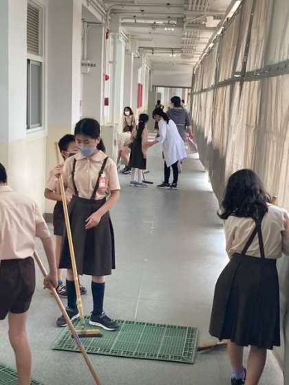 今週は、たてわり班清掃です。高学年が教えながら低学年と協力して分担場所を掃除しました。