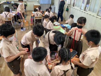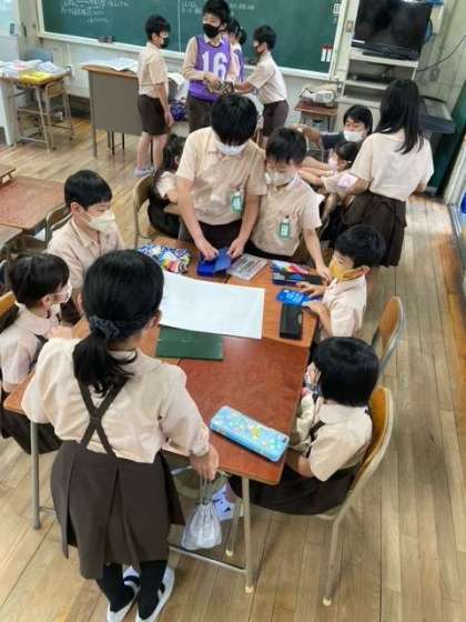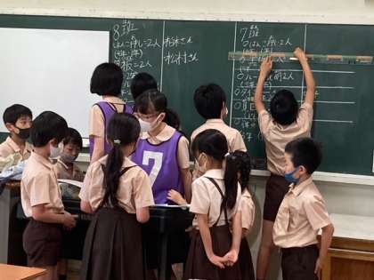 サマーフェスティバルに向けて2時間目に、たてわり班活動をしました。役割分担をしてペアで活動します。各班の6年生は1年生にも分かりやすいように丁寧に説明していました。