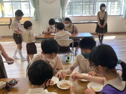 午前中にサマーフェスティバルがありました。22のたてわり班が11のお店を出し、回る班と店番を交代します。
