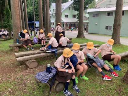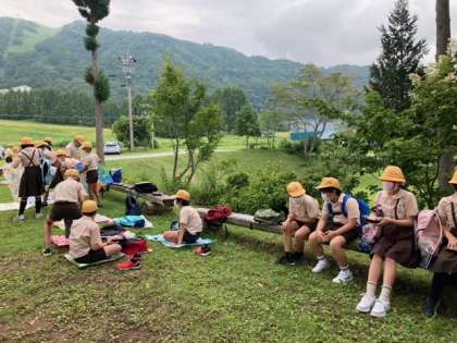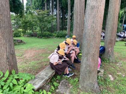 丁度良い曇り空で涼しいです。班ごとに弁当を食べた後には、山登りです。