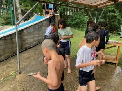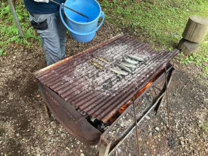 自分たちで捕まえたヤマメやニジマスを薪で焼いて頂きました。とっても美味しかったです。