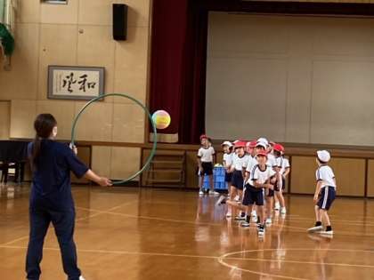 2年生は体育で「ボール投げ」をしました。的をめがけて力いっぱいボールを投げました。スピードが速くなり、コントロールも良くなってきました。