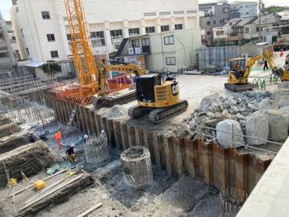 工事でコンクリートの固まりを砕く音が聞こえる中でも、集中して取り組んでいます。