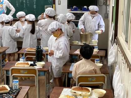 給食当番は、協力して手際良く準備をしています。食欲も増し、美味しくいただいています。