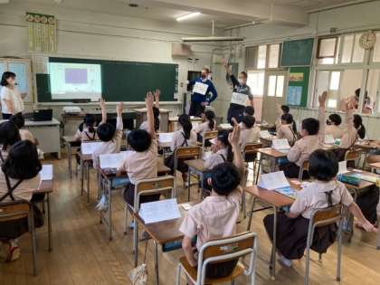 3年生の外国語活動で「アルファベットの読み方になれよう」の学習しました。校内研修で教育センターから講師の先生を招いて教員も参観し、授業改善について討議をしました。