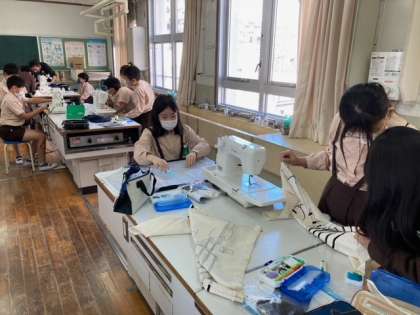 5年生は「エプロン作り」でミシンを上手に使って自分で使うエプロンを丁寧に作っていきます。