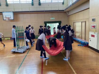 中休みの時間に6年生が体育館の整備をしてくれました。重いマットを力を合わせて元の場所に戻して使いやすくしてくれました。