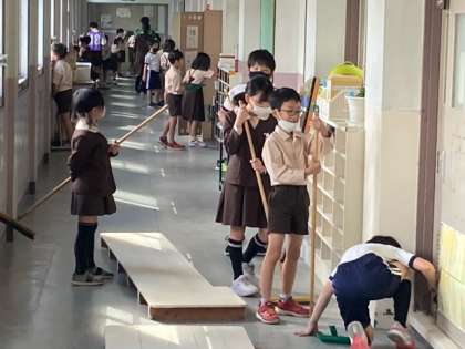 今週は、たてわり班清掃です。オリエンテーリングの続きで協力しながら分担場所をきれいにしています。