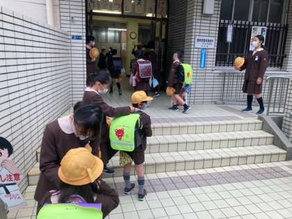 今週は「元気up週間」です。自分で、寝る時刻・起きる時刻を決めて規則正しい生活習慣を意識する1週間です。登校時の挨拶や身だしなみについて高学年のボランティアが手本になっています。
