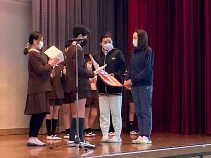 児童朝会で給食週間の取り組みとして、給食調理員さんに感謝のメッセージを贈りました。これからも好き嫌いせずに残さず食べて丈夫な体を作りたいです。