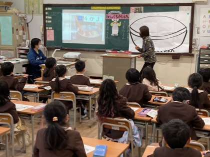 栄養指導では1年生が栄養教諭のお話を聞いて、給食への関心を高めました。