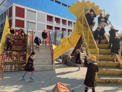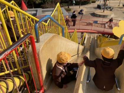 お弁当の後は公園で自由遊びをしています。良い天気で体を動かしているので寒さを感じません。