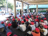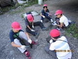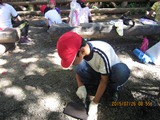 2日目の活動のはじめは焼き板みがきです。真っ黒に焼かれたスギの板のすす落としをします。古歯ブラシや新聞紙を使って、皆熱心にすすを落としていました、気が付くと顔にすすがついている人もいました。気づかないくらい夢中ですすを落としていたようです。