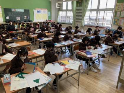 1年生の図工「いろはんが」では、自分で描きたいものを下がきして、シールになっている色用紙を切って作品を作っています。ハサミを上手に使って細かく丁寧に作業を進めています。