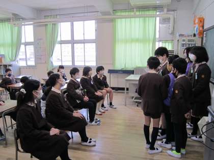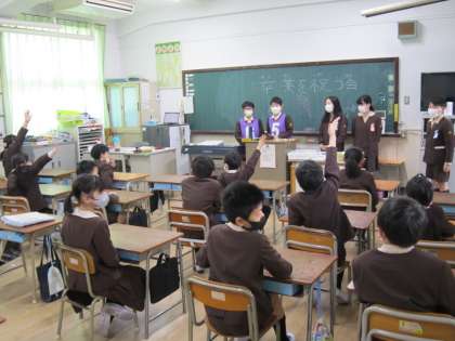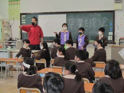 3月3日(金)、児童会行事「卒業を祝う会」が行われました。感染症予防のため今年度も講堂ではなく、各たてわり班ごとの教室に集まって行われました。卒業する6年生に向けて今までの感謝の気持ちを込め、5年生代表がメッセージを送ったり、班全員でゲームをしたりして楽しみました。また、6年生が一人ずつあいさつをする場面もありました。
