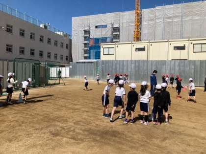 今日は、暖かくてとても良い天気です。1年生は体育で「うずまきジャンケン」をしました。順番やルールを守って楽しく運動しました。