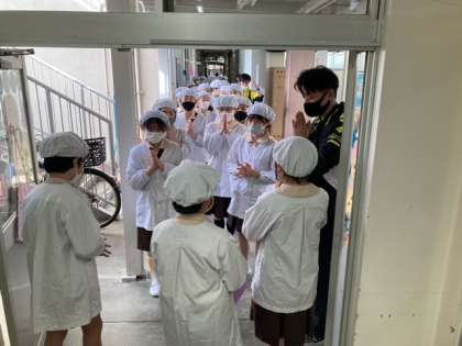 6年生の最後の給食です。給食当番も白衣を着るのもこれで終わりです。給食の味を忘れずにいてほしいです。