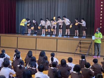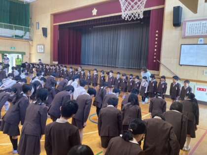 今日は初めての全校朝会がありました。1年生は2〜6年生と顔を合わせ、みんなで「よろしくお願いします」と元気よく挨拶をしました。その後、6年生の代表が登校時の挨拶ね仕方についてお手本を見せてくれました。