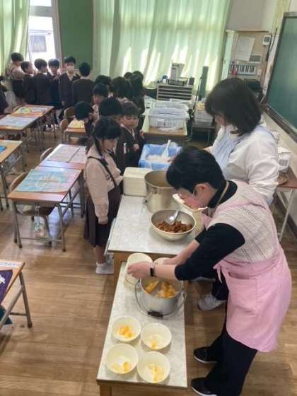 給食は入学お祝い献立でした。カツカレーやゼリーを美味しくいただきました。慣れるまでは、6年生が運んでくれています。1年生が感謝している6年生は、頼りになるリーダーです。