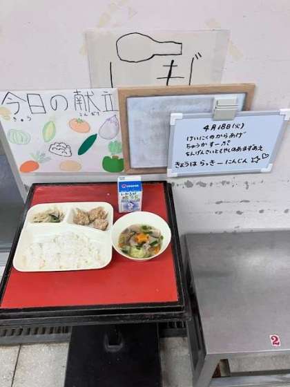 ・鶏肉のからあげ ・中華スープ ・チンゲンサイともやしの甘酢あえ