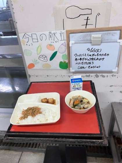 ・鶏肉とじゃがいもの煮物 ・あつあげのしょうゆだれかけ ・紅ざけそぼろ ・ごはん