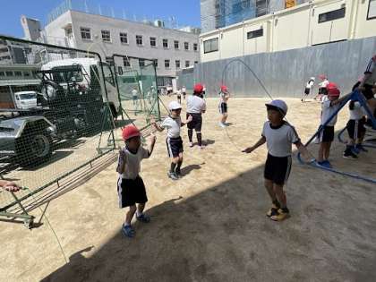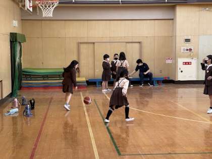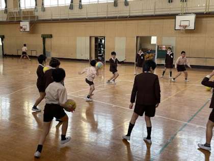 4年生は講堂でドッジボールやバスケットボールをしています。