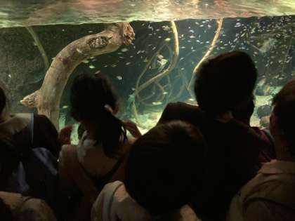 熱帯魚や皇帝ペンギン、カマイルカ等、人気の生き物が迎えてくれています。来たことのある児童も初めて来た児童も夢中になって観察しています。