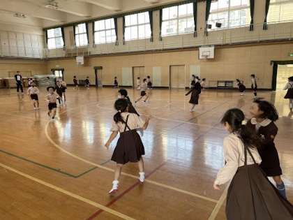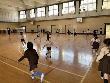 15分休み、2年生は講堂で「おにごっこ」を、3年生は運動場で「なわとび」や「てつぼう」を楽しんでいます