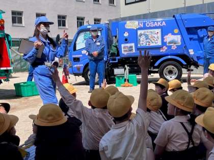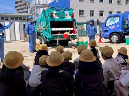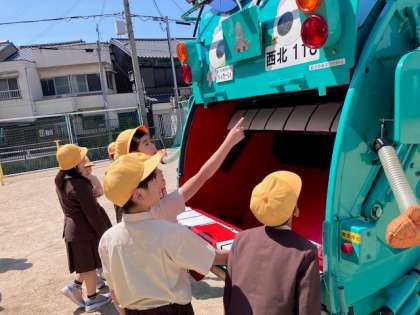 本日午前中に、環境局の方が来られ、パッカー車の仕組みや、ごみの収集について教えてくださりました。ごみがどのようにパッカー車の中に集められるのか、反対にどのように集めたごみを出すのかを実際に見せていただきました。子どもたちは「おぉー!」と歓声をあげながら、楽しく学ぶことができました。