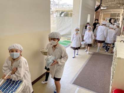 自分たちが食べる給食を運んでいます!おいしくいただきましょう!!