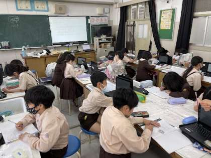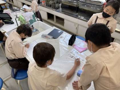 四年生の理科では、「地面を流れる水と地面のかたむきの関係」について、実験の方法を班で話し合っています。たくさんの意見や考えを出し合ってね!