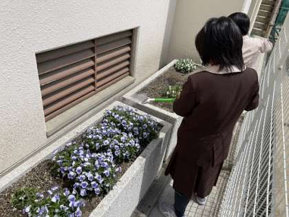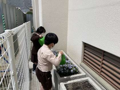 お昼休み、栽培美化委員会の児童が花壇の水やりをしてくれています!