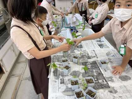 5年生の理科では「子葉がしぼんだ植物がさらに成長するにはどんな条件が必要があるのか」について調べるために、植物を準備しました。
