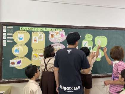 食べものを仲間分けしています。栄養教諭さんのお話を一生懸命聞いて考えています!