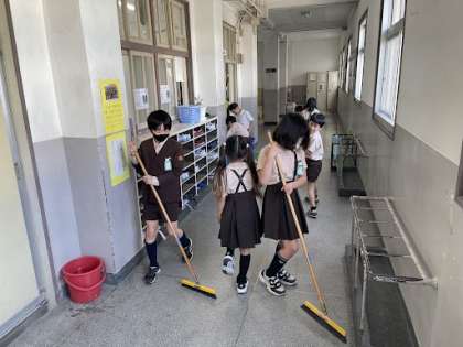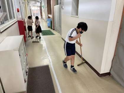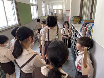 掃除の時間です。毎日高学年が低学年に、掃除を教えてくれています!