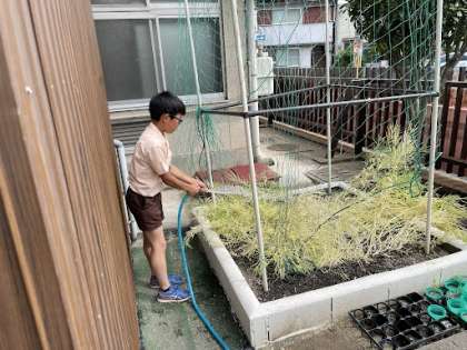 休み時間に栽培美化委員会の児童がホースを使って水やりをしてくれています!
