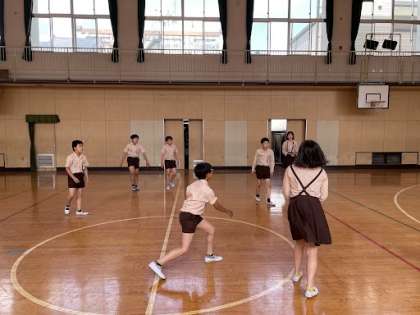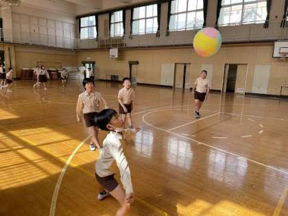 休み時間、講堂で6年生がバレーボールを使って元気に遊んでいます!!