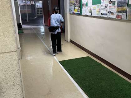 今日は大雨です。濡れてしまった廊下を先生が拭いています!